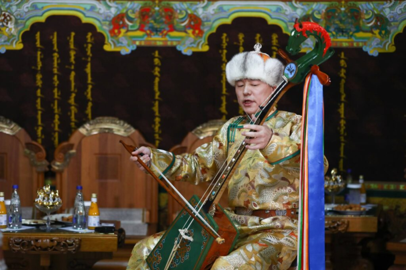 Төрийн золголтын дараа Соёлын тэргүүний ажилтан, ерөөлч, магтаалч, морин хуурч Ц.Соёл-Эрдэнэ Төрийн хан хуурын хөгийг тэгшиллээ.